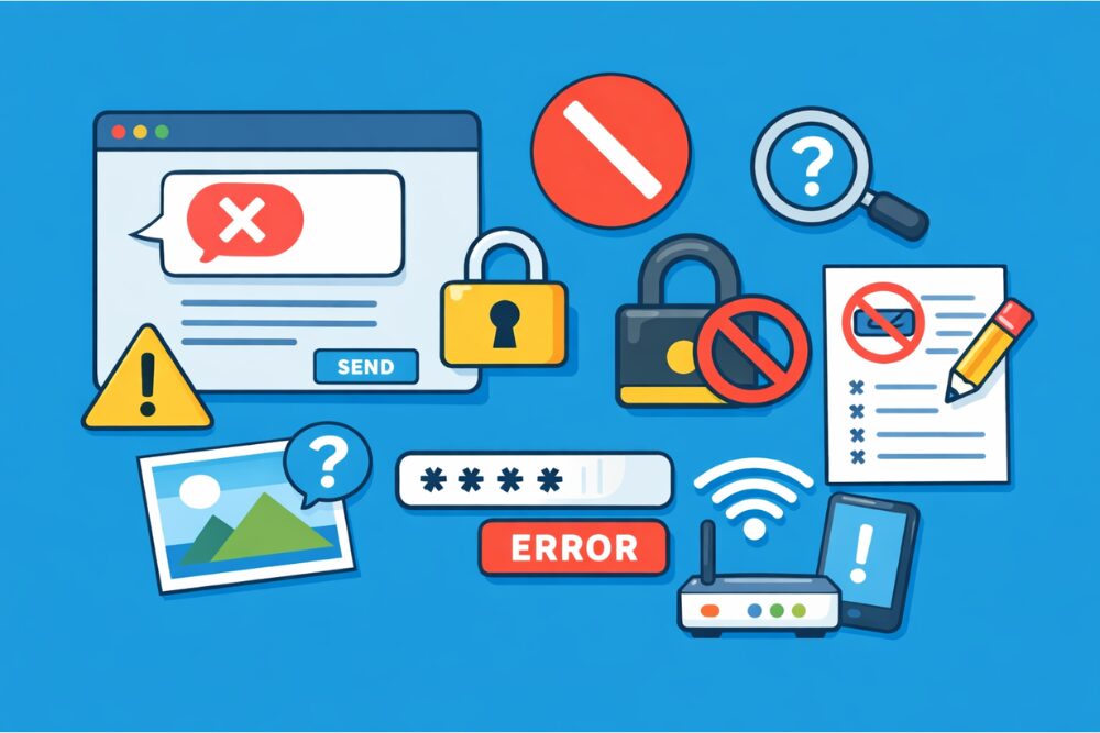送信できない・エラーが出る 書き込み制限、禁止ワード、ログイン不整合 ログイン状態と文面を見直す