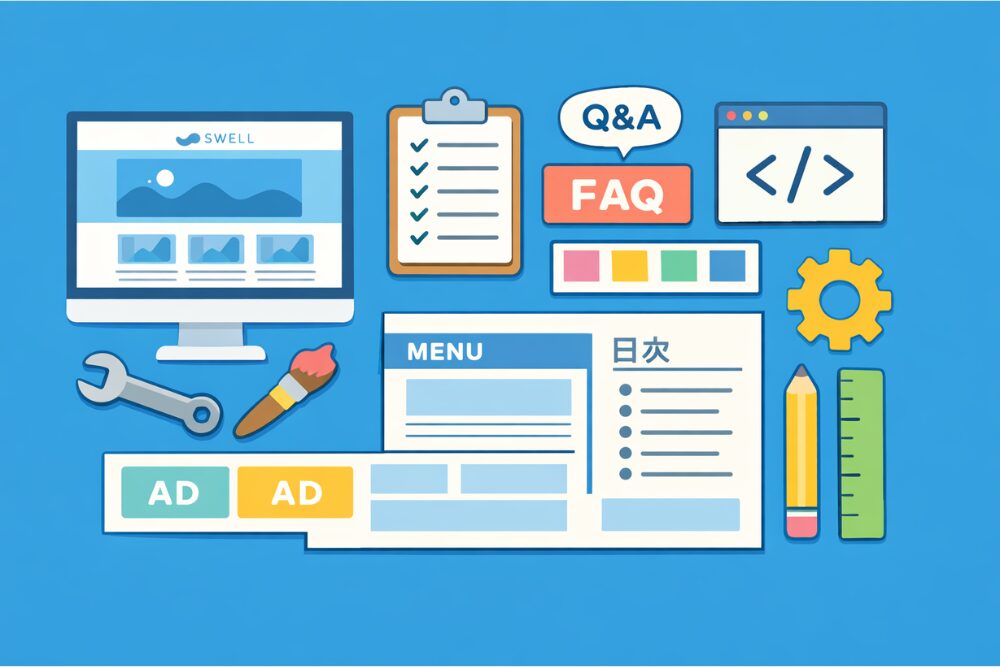 SWELLは便利なパーツが多いぶん、全部オンにすると情報量が多くなりがちです。特に目次やSNSボタン、記事下エリアは、役割を整理しながら選ぶのがおすすめです。