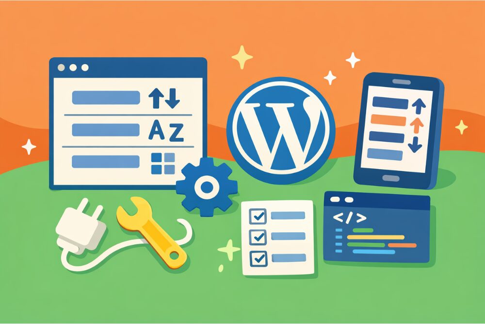- 簡単に済ませたいなら、並び替え用プラグインを1つだけ導入して、管理画面からドラッグ&ドロップで順番を調整する方法が手っ取り早いです。