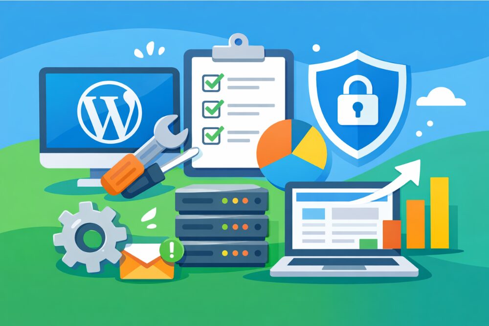 本体とプラグインの更新、バックアップと復旧テスト、サーバーやセキュリティの監視など